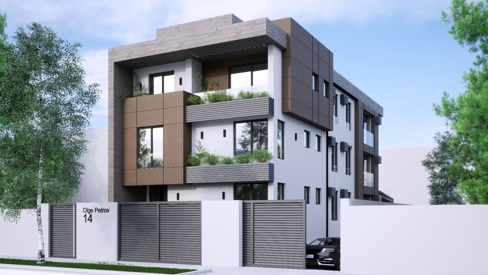 Olge Petrov 14, Novi Sad – Lux VILA sadrži tri stana, površine od 145 do 155 metara kvadratnih. Privatnost i sigurnost vile je osigurana kliznom kapijom s kontrolom pristupa, koja vodi u podzemne garaže i ostave.